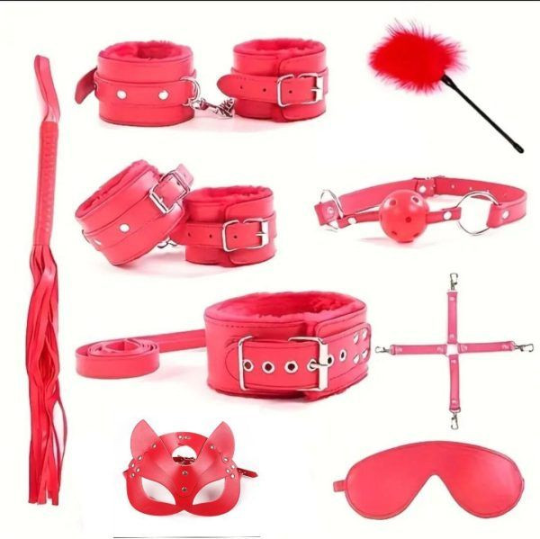 محتویات ست فانتزی زناشویی ده تیکه چرم و خز درجه یک گارتر (ارباب و برده)